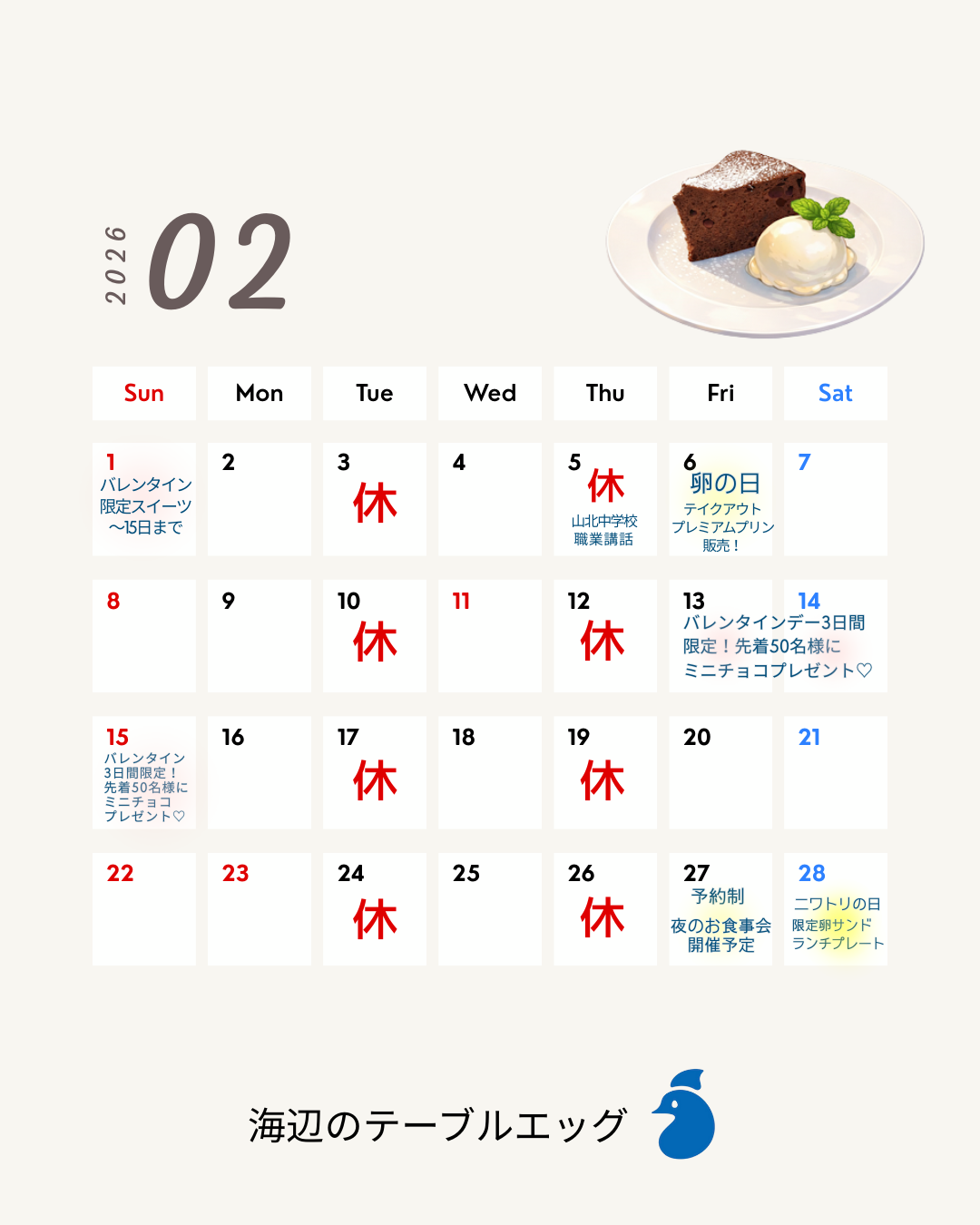 2月は毎週火曜日、木曜日定休日です。
